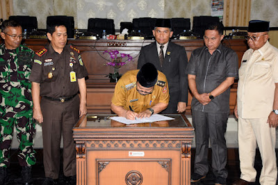 | Bupati Agam, Dr H Andri Warman saat mendatangani nota kesepakatan Ranperda pengelolaan keuangan daerah tahun 2023 menjadi Perda. (Foto : Pro-KP Agam) |
